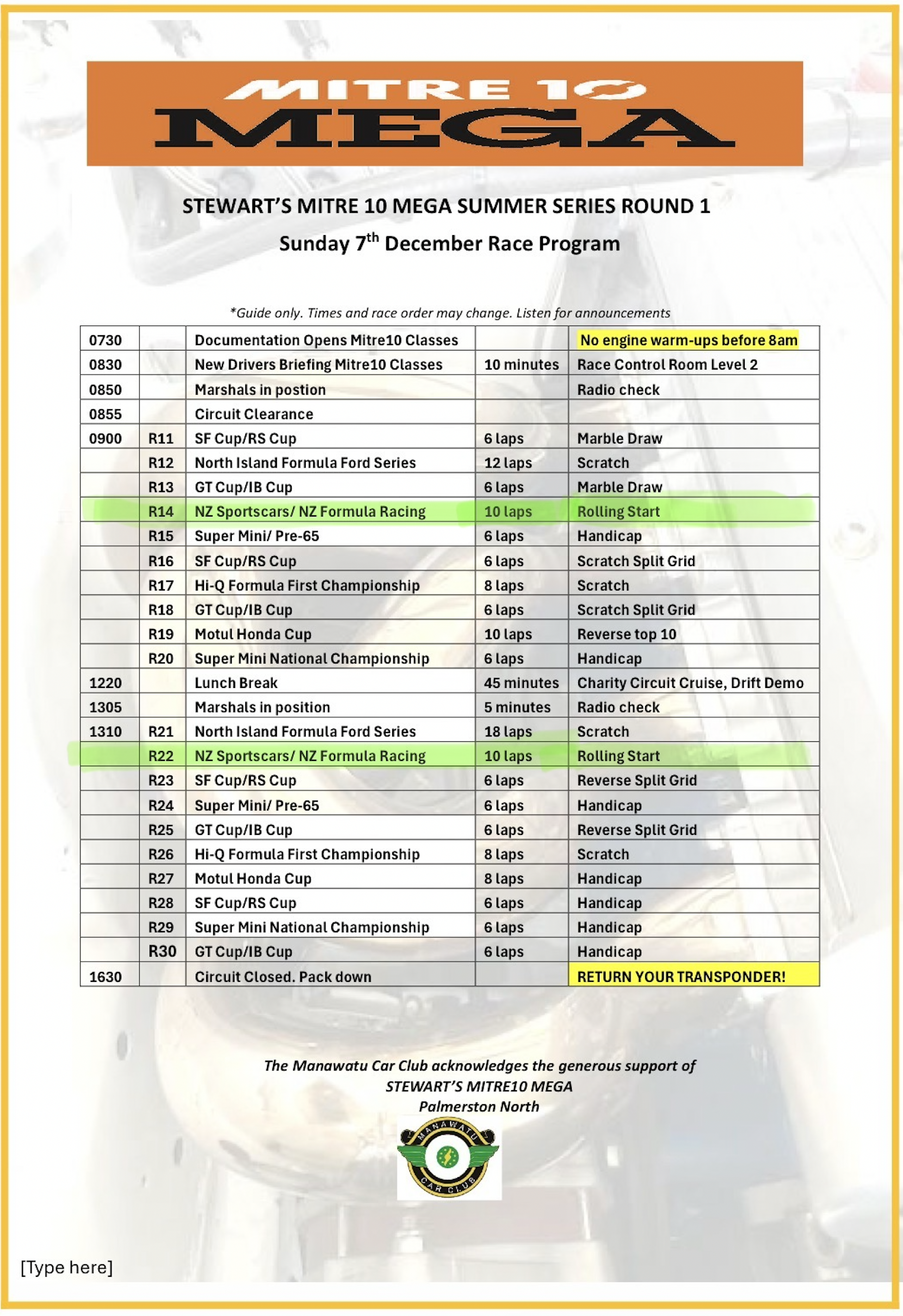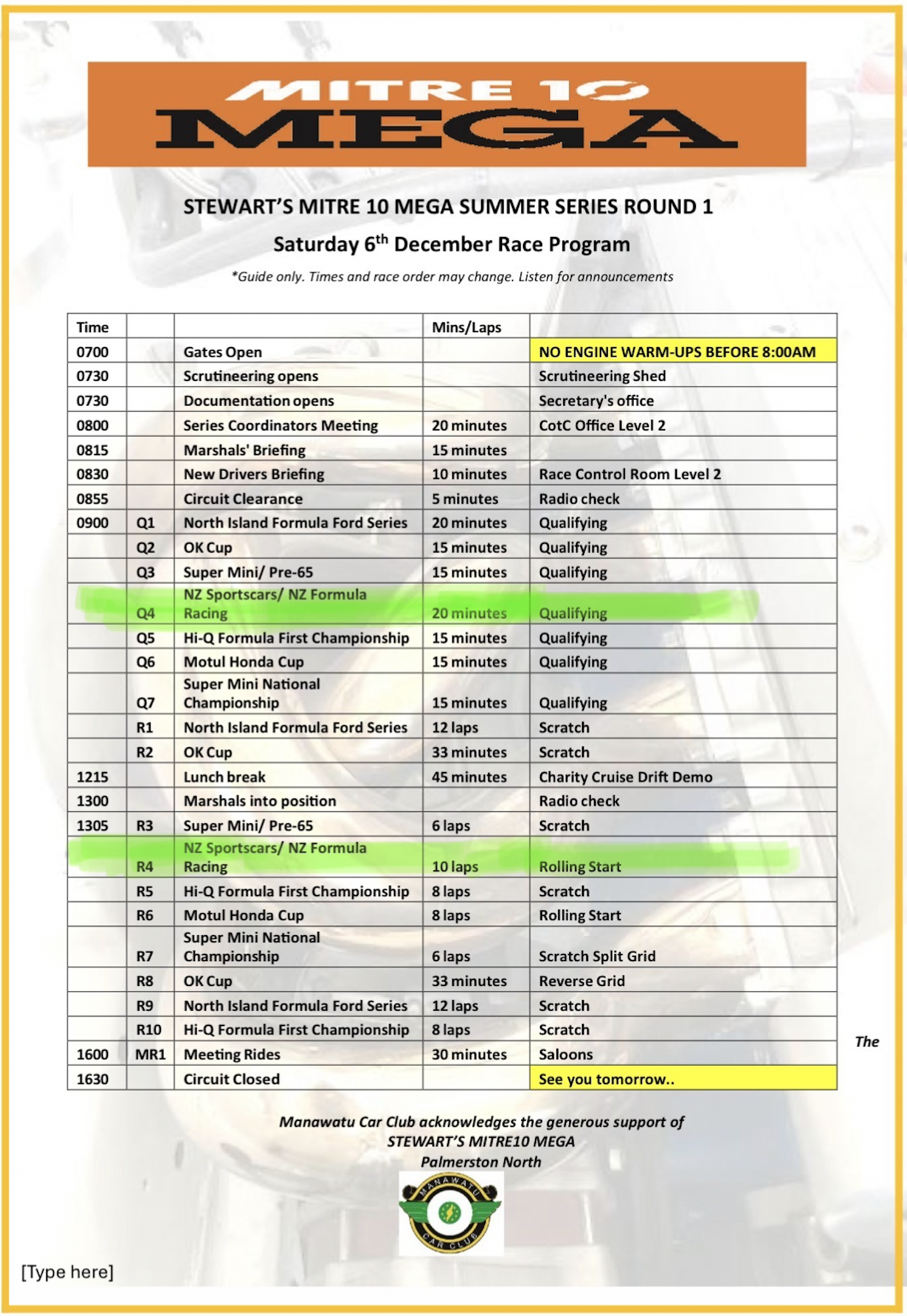 There will be no general driver's briefing. However, there will be a NZSCR & FRNZ briefing outside the secretary’s office at 8:45am on Saturday